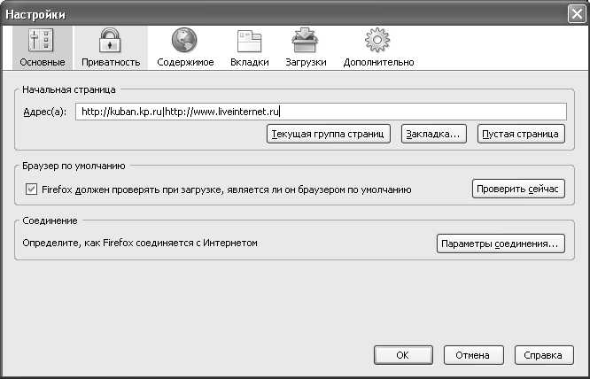 После того как вы открыли свою любимую страничку или выяснили настройки прокси, выберите пункт меню Инструменты | Настройка. В открывшемся диалоговом окне Настройки параметров довольно много, и вы окажетесь на первой вкладке настроек – Основные. Основными настройками разработчики Firefox окрестили три группы настроек: Начальная страница, Браузер по умолчанию и Соединение.