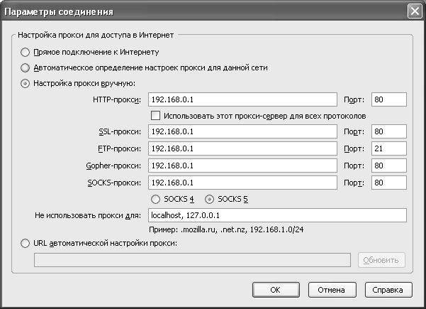 В области Соединение есть кнопка Параметры соединения на тот случай, если ваш компьютер подключен к Интернету через так называемый прокси-сервер (Proxy). Proxy, или прокси-сервер предназначен для ускорения загрузки страниц с повторяющимися элементами. Кэширующий прокси-сервер чаще всего используют в корпоративных сетях, чтобы уменьшить объем входящего трафика, но иногда его используют также в частных или домашних сетях. Параметры прокси-сервера всегда можно узнать в IT-отделе фирмы или у человека, выполняющего функции системного администратора вашей сети. В подавляющем большинстве случаев для всех протоколов используется один IP-адрес и несколько портов, которые нужно указать в диалоге Параметры соединения примерно так, как показано на рис. 1.5.