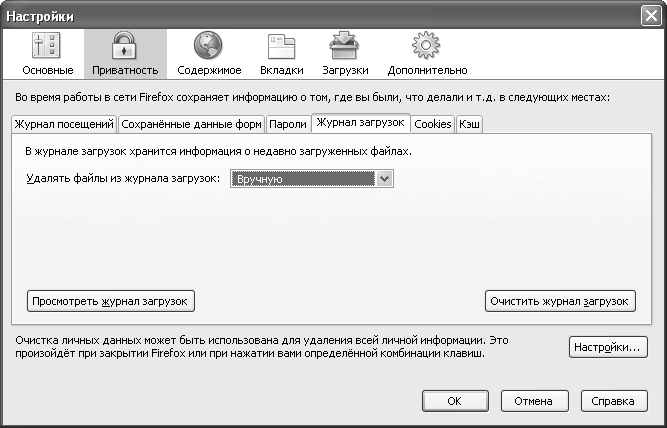 Рис. 1.8. На вкладке Журнал загрузок можно настроить автоматическое удаление, просмотреть список закачек в Менеджере загрузок и очистить журнал загрузок