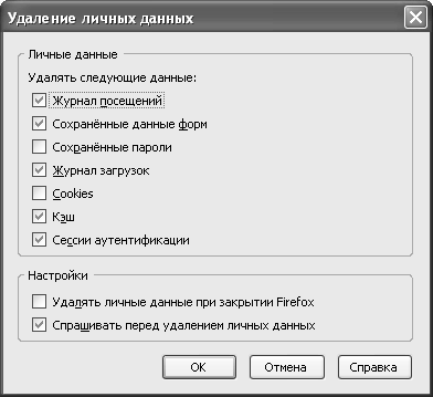 Как и другие браузеры, Firefox ведет журналы посещения сайтов, сохраняет пароли и настройки определенных сайтов. Однако если вы не хотите, чтобы ваш шеф раньше времени узнал, что вы нашли кое-что интересное на сайте hotjob.com, или просто опасаетесь, что ваш компьютер могут исследовать на предмет посещения небезопасных для карьеры сайтов, то личные данные можно удалить в любое время, выбрав пункт меню Инструменты | Удалить личные данные. По умолчанию удаляются журналы посещений и загрузок, личные данные форм, кэш и сессии аутентификации, но можно заставить программу удалить также пароли и переменные в cookies.