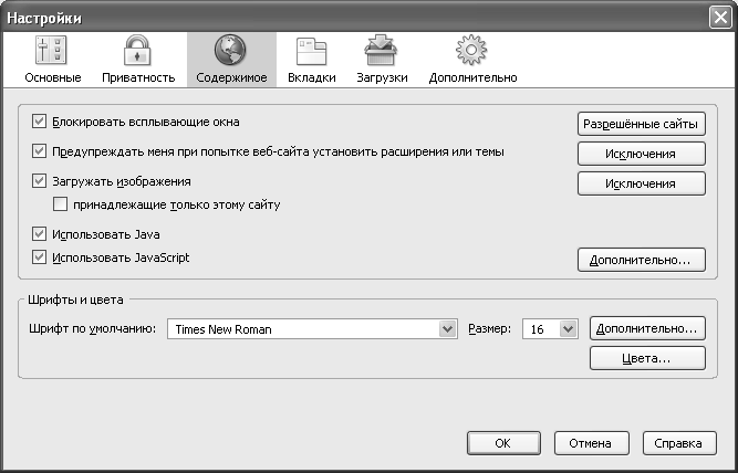 Сразу же после установки Firefox фактически настроен на оптимальный режим блокировки рекламы, но вы можете добиться большего, потратив немного времени на настройку. Выберите пункт меню Инструменты | Настройки и в открывшемся диалоговом окне перейдите на вкладку Содержимое. Для защиты от самостоятельно открывающихся окон там должны быть отмечены первые две позиции так, как показано на рис. 1.12.
