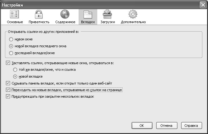 Следующий шаг в борьбе с несанкционированно размножающимися окнами – запрет тех, что открываются в новом окне после нажатия на ссылку с атрибутом открытия нового окна. В Firefox можно заставить такие ссылки открывать страницу в том же окне, где находится сама ссылка, или создавать в таких случаях новую вкладку. Для этого в окне Настройки выберите раздел Вкладки (рис. 1.13) и отметьте пункт Заставлять ссылки, открывающие новые окна, открываться в и новой вкладке. По моему скромному мнению, логично будет сразу просмотреть открывшуюся по выбранной ссылке страницу, поэтому рекомендую также отметить пункт Переходить на новые вкладки, открываемые из ссылок на странице.