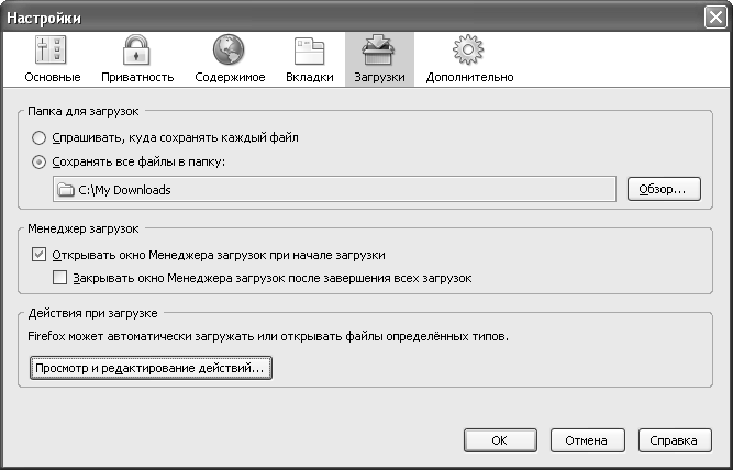 Чтобы отделить мух от котлет, я предлагаю создать специальную легко доступную папку, например, "My Downloads" в домашнем каталоге пользователя или, если вы единственный пользователь компьютера, непосредственно на диске С: (или D: в случае, когда диск разбит на два раздела). Для этого в диалоговом окне Настройки откройте вкладку Загрузки (рис. 1.14), выберите пункт Сохранять все файлы в папку, нажмите кнопку Обзор, в открывшемся диалоговом окне выберите Мои документы или Мой компьютер | Диск С:, нажмите кнопку Создать папку и введите что-нибудь вроде мои загрузки.