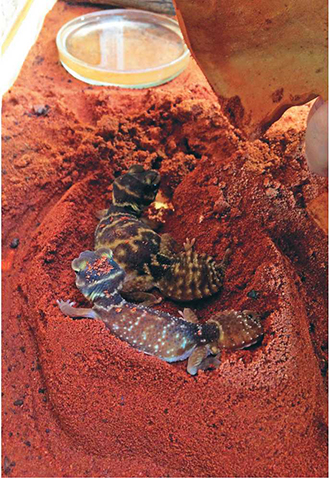В Европе на рынок террариумистики активно продвигается так называемое укрытие-поилка. Вряд ли это можно назвать удачным комплексным решением, однако любители охотно используют их в террариуме. При размещении поилки в террариуме необходимо учитывать ее глубину и способность геккона выбраться из нее. Мы уже много лет используем в качестве поилок чашки Петри (Крымов, 2016). Они легко моются и дезинфицируются. Во избежание попадания в них молодых особей ближе к краю чашки размещается небольшой плоский камень небольшого размера, чтобы геккон мог легко выбраться из поилки.
