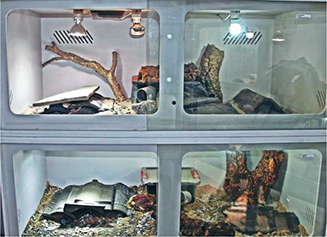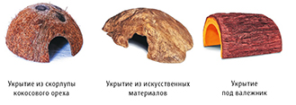 Как правило, укрытия устанавливаются в местах с разными температурными режимами для аридных (сухолюбивых) видов и разными уровнями влажности для тропических. Это два-три укрытия, лучше глиняных, которые гигроскопичны и хорошо сохраняют влажность.