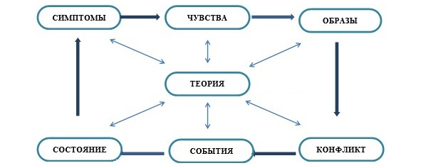 Гипотеза с помощью теоретических построений объединяет в единой системе: симптомы – чувства – образы – внутренний конфликт – события прошлого – хроническое негативное состояние.
