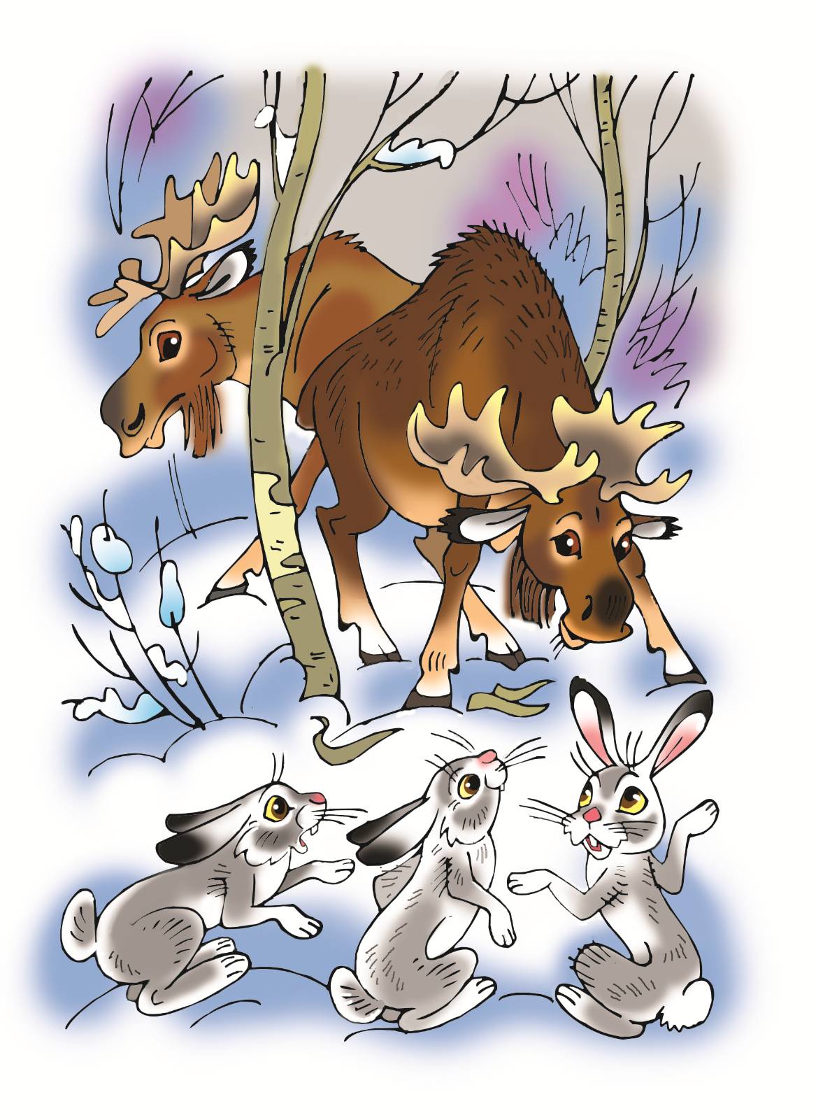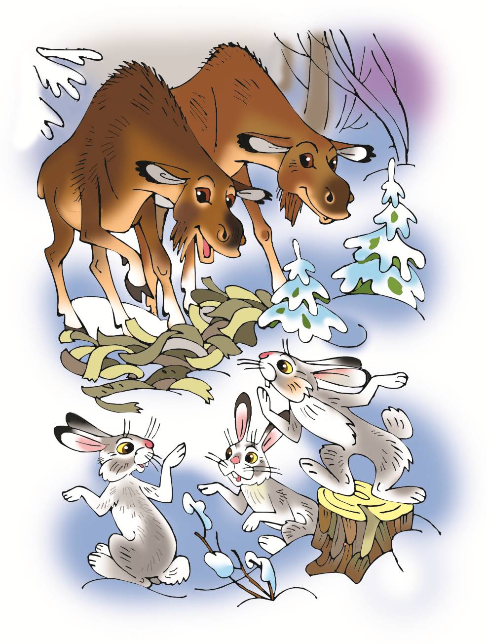 К этому времени серые Зайчики сме-нили шубки на белоснежные и стали неза-метными для хищников, но сами оголодали так, что терпеть невмочь. Заявились они на Лосиную полянку.
