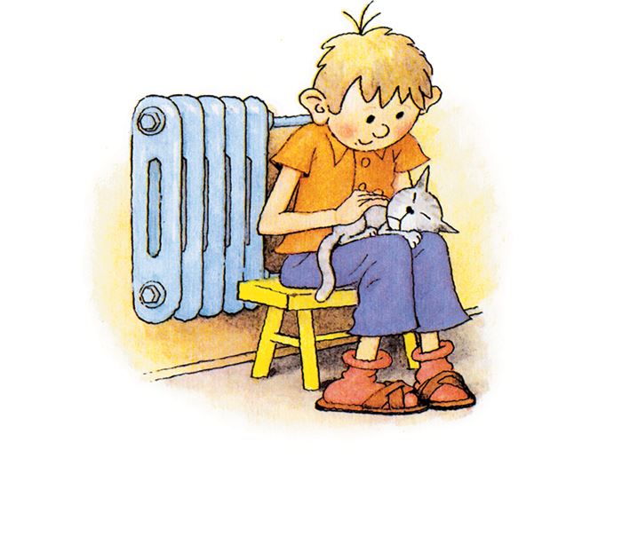 Виталик взял Мурзика и понёс к батарее сушиться. Он посадил его на скамеечке и сел рядом с ним. Мокрая шерсть на Мурзике торчала в разные стороны, как иголки у ёжика, и от этого Мурзик казался таким худым-худым, будто целую неделю совсем ничего не ел. Виталик вынул из кармана котлету и положил перед Мурзиком. Мурзик съел котлету, потом забрался на колени к Виталику, свернулся калачиком и замурлыкал свою песенку.