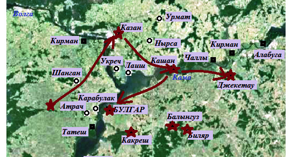 – Тохтамыш недолго держался на Болгарской земле, собрав с местного населения «и злато и сребро и дары многы», чтобы призвати «Татаръ отовсюду к себе», предпринял поход в районы, расположенные севернее Нижней Камы. И собрав татарское войско, удалился в Крым.