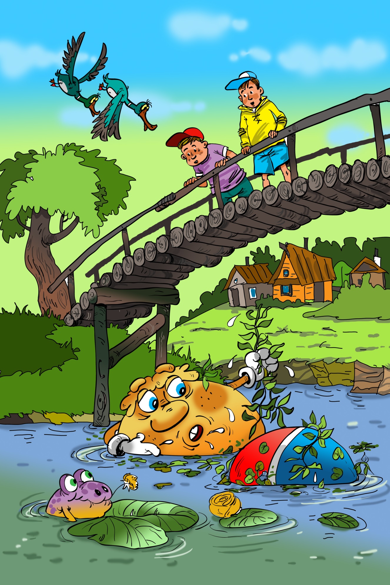 – Не плачь, мячик в речке не утонет, он же резиновый, – крикнул Колобок и смело бросился в воду.