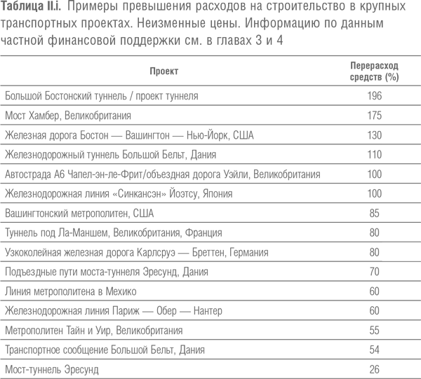 Как упоминалось в главе 1, Ассоциация крупных проектов в своей недавней публикации говорит о «многострадальной истории финансовых перерасходов в очень больших проектах в государственном секторе»[44]. Помня о туннеле под Ла-Маншем, который находится в частной собственности, получает частное финансирование и эксплуатируется частной компанией, следует добавить, что не существует явных свидетельств тому, что перерасход средств в крупных проектах является исключительно феноменом государственного сектора или что перерасхода можно избежать, просто разместив проекты в частном секторе, даже если это может помочь усилить дисциплину и ответственность в крупных проектах, как мы это увидим далее (см. таблицу II.ііі).