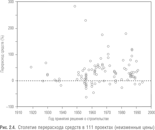 На рис. 2.4 показан график перерасхода средств по сравнению с годом принятия решения о строительстве для 111 проектов в том виде, в каком эти данные были доступны. На диаграмме, похоже, не показано влияние временного фактора на перерасход средств. Статистические тесты подтверждают это впечатление. Исследование с использованием года завершения вместо года решения о строительстве с данными для 246 проектов дает такой же результат. Исходя из этого, мы делаем вывод, что перерасход средств не снижается со временем. Превышение запланированных расходов сегодня находится на том же уровне, что и 10, 30 или 70 лет назад. Если методы и навыки для оценки затрат и избежания перерасхода средств в транспортных инфраструктурных проектах и улучшились со временем, то в данных это не отражено. Создается впечатление, что никакого изучения данного явления в этом важном и очень дорогостоящем секторе принятия решений на государственном и частном уровне не ведется. Это кажется странным и наводит на мысль, что неизменное существование во времени и пространстве типа проектов со значительным и широко распространенным перерасходом средств – признак того, что достигнуто некое равновесие. Сильные стимулы и слабые препятствия для недооценки затрат и перерасхода средств могли научить промоутеров проектов тому, чему они научились, а именно, что недооценка расходов и перерасход средств окупаются. И если дело обстоит именно так, то перерасход средств – вполне предсказуемое явление, как и его преднамеренная природа.