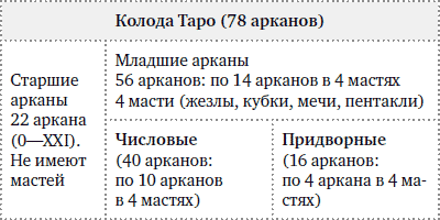 Карты в колоде делятся на несколько групп: Старшие (или Мажорные) и Младшие (или Минорные) арканы. Младшие арканы состоят из четырех мастей и, в свою очередь, делятся на две подгруппы: Числовые арканы (от Туза до Десятки) и Придворные арканы (Пажи, Рыцари, Королевы и Короли).