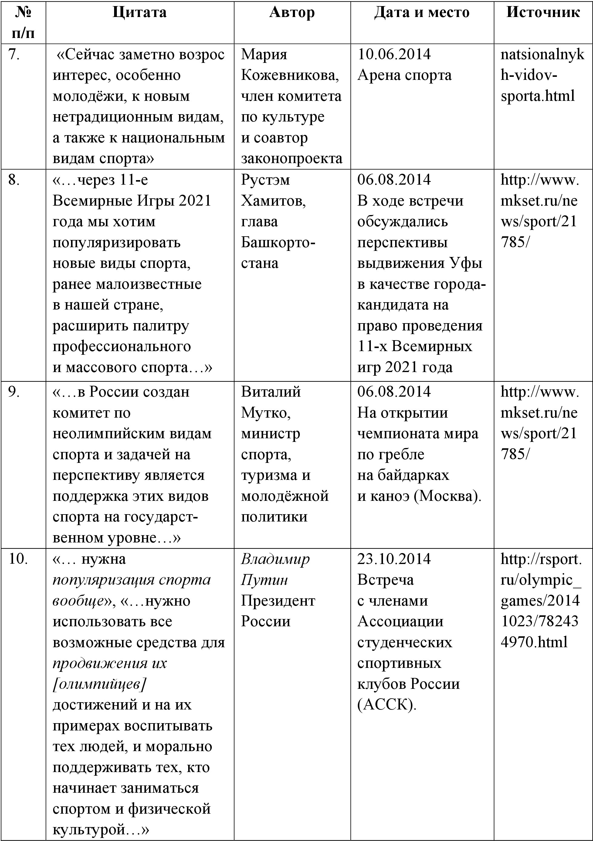 Нами также была произведена подборка из 11 речей (выступлений) лидеров государства и отрасли «Физическая культура и спорт», содержащих высказывания (цитаты), касающиеся проблемы формирования интереса подростков и молодёжи к участию в спортивном движении и популяризации отдельных видов спорта (табл. 1.1).