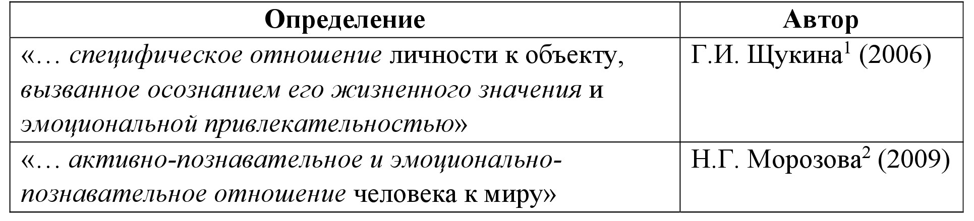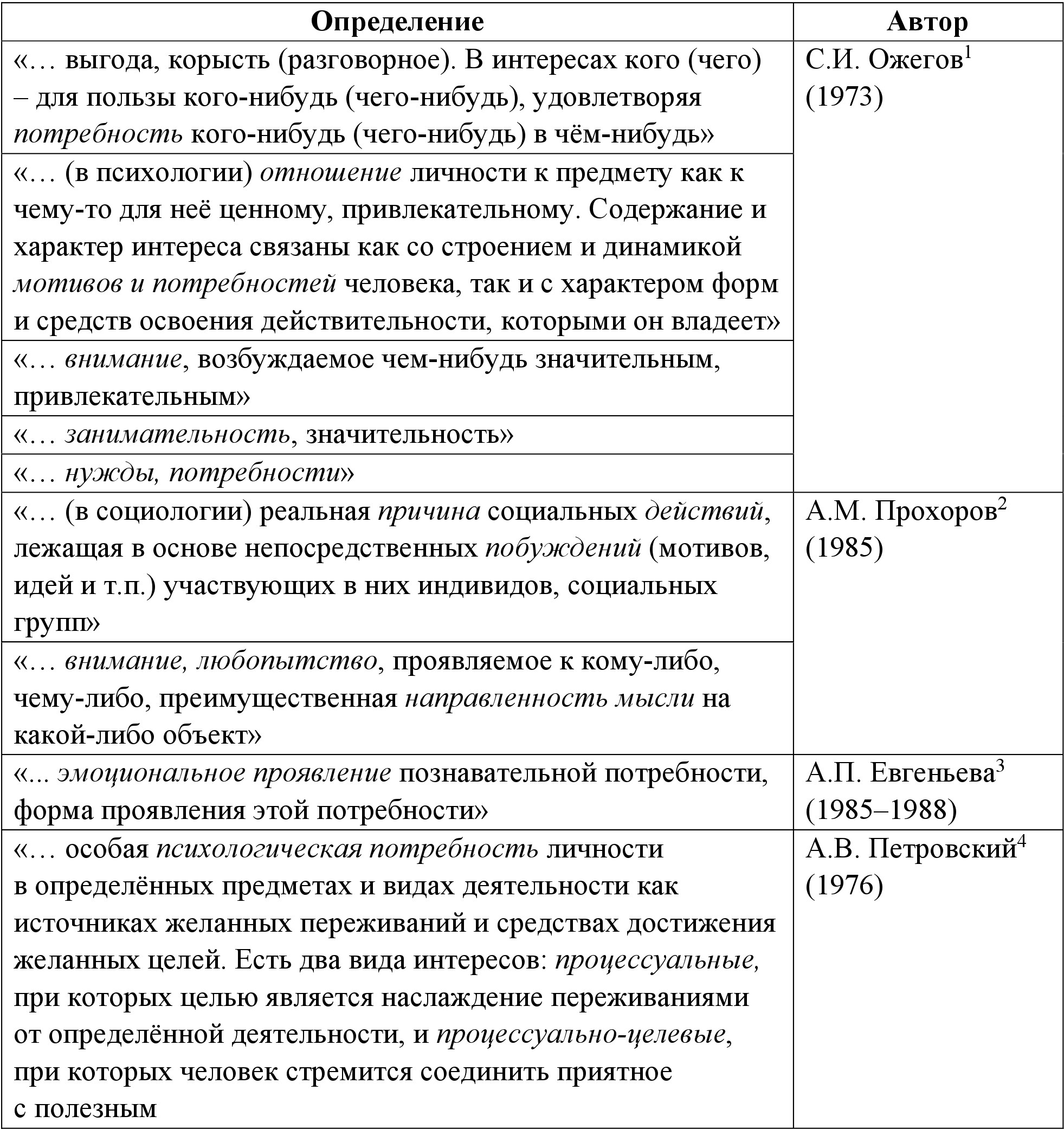 Как видно из данных табл. 1.2, для раскрытия сущности понятия «интерес» ключевыми словами выступают: «стремление», «влечение», «установка», «направленность на (объект, деятельность)», «внимание», «занимательность», «нужда», «потребность», «мотив», «причина действий и побуждений», «эмоциональное состояние», «отношение», «эмоция», «мотивация», «любопытство», «желательность объекта», «потребностное отношение к объекту», «осознание значимости и эмоциональной привлекательности объекта».