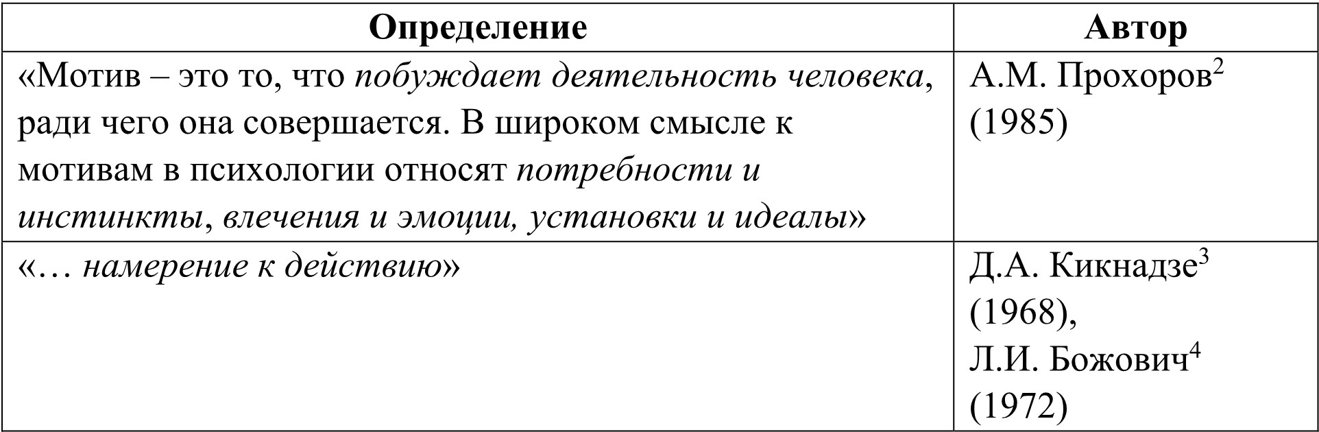 Признавая справедливость данной точки зрения, приведём сводную таблицу определений понятия «мотив» (табл. 1.3).