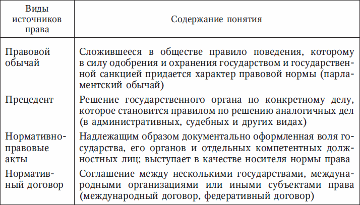 В мировой практике известны различные виды источников права: правовой обычай (обычное право), нормативный акт государственных органов (закон и др.), судебный прецедент, договор нормативного содержания, общие принципы, идеи, доктрины. Одним из основных видов источников права являются законы (табл. 1.)