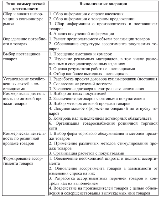 Коммерческую деятельность, осуществляемую организациями торговли, можно условно разделить на несколько этапов, на каждом из которых выполняются определенные коммерческие операции (табл. 1).