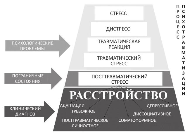 Понятие о психотравматизации. Люди с психическими травмами, как правило, страдают симптомами страхов, панических атак и даже фобий на фоне складывающихся с окружающими межличностных отношений. Данная феноменология объясняется проявлением поведенческих и эмоциональных состояний, связанных с наличием частого межличностного переноса, который характеризуется значительным недоверием из-за переживаний влияния образа обидчика, который повторно психотравмирует и раздражает, а также интерактивно провоцирует переход от психологического стресса к хроническому психическому расстройству. На рис. 1.1 показана схема развития процесса психотравматизации.