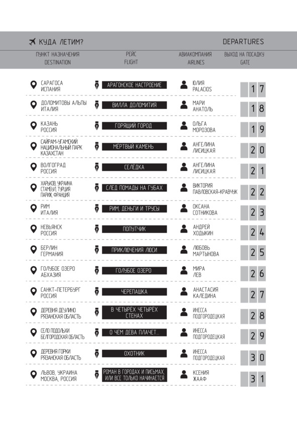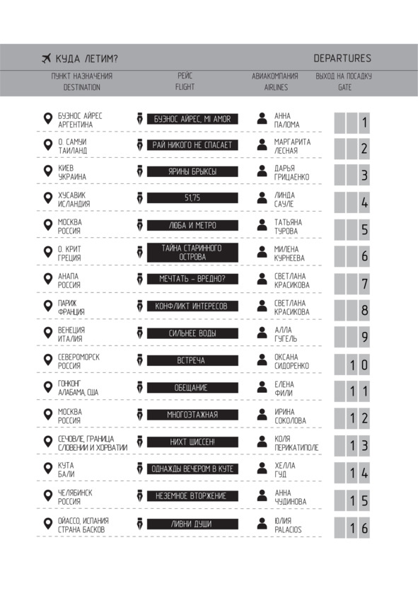 Авторы: Палома Анна, Лесная Маргарита, Грицаенко Дарья, Сауле Линда, Турова Татьяна, Курнеева Милена, Красикова Светлана, Гугель Алла, Сидоренко Оксана, Фили Елена, Соколова Ирина, Перикатиполе Коля, Гуд Хелла, Чудинова Анна, Palacios Юлия, Анатоль Мари, Морозова Ольга, Лисицкая Ангелина, Павловская-Кравчук Виктория, Сотникова Оксана, Ходыкин Андрей, Мартынова Любовь, Лев Мира, Каледина Анастасия, Подгородецкая Инесса, Жааф Ксения