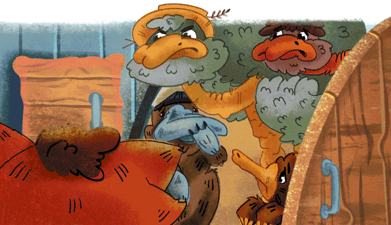 Кот растерянно поднял плед. Вдруг нежно-зелёное яйцо найдет своих родителей? Страус с надеждой вытянул шею, но сразу погрустнел. Он хрипло извинился и обнял убитую горем жену.