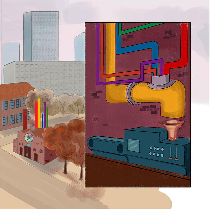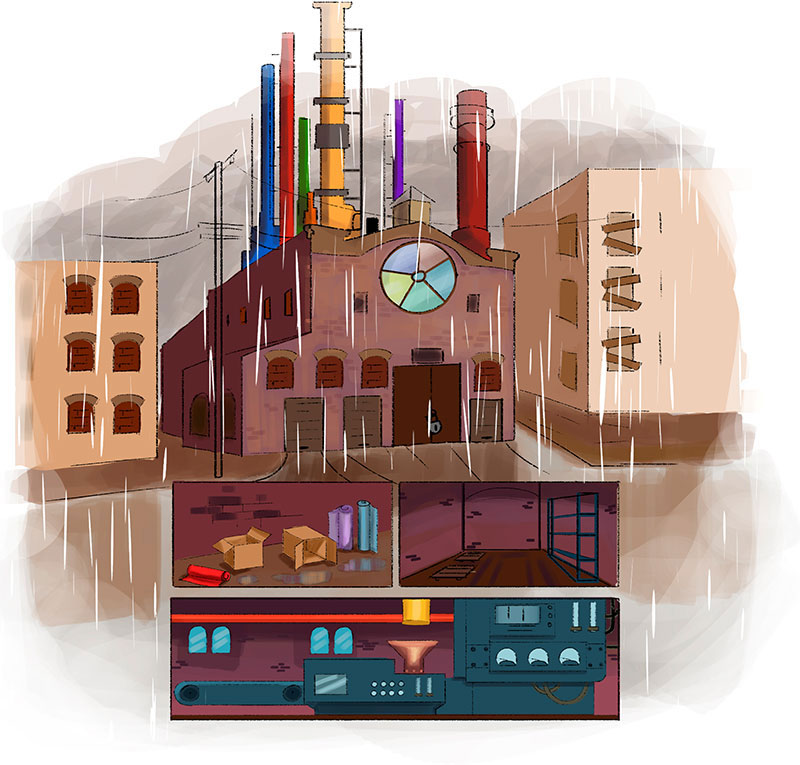 На первом уровне цветового цеха проходили три трубы основных цветов: красная, синяя и желтая. Они поднимались кверху и замыкались с трубами дополнительных цветов в главной воронке. Дополнительные трубы были окрашены в фиолетовый, оранжевый и зеленый цвета.
