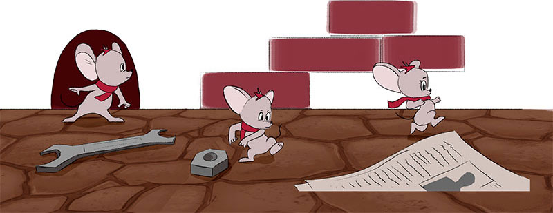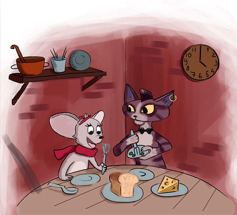 Сегодня обед не начался в обычное время, и мышь, нервно почесывая голову вилкой, поглядывала на кота, который раскладывал по тарелкам еду. Домосед не обращал на нее внимания до тех пор, пока она не начала помогать ему раскладывать приборы. Но мышь так спешила, что хвостом сбивала еду с тарелки на пол и этим ужасно раздражала кота.