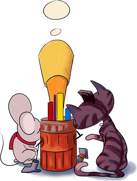 Больше всего времени мышь и кот проводили в цехе визуализации. Здесь из маленьких стеклышек собирались картинки. Оп-ля! И перед глазами возникало изображение проносящейся мысли. Сидя перед тестовым калейдоскопом, они наблюдали за мелькающими образами.
