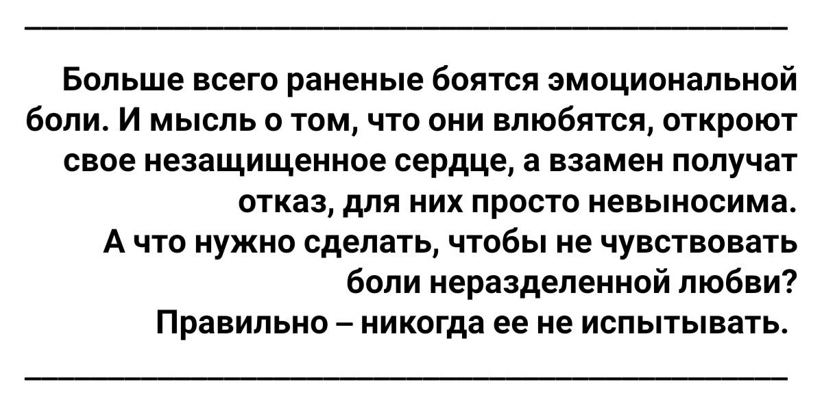 Поскольку раненые в нашем обществе – преобладающий тип, рано или поздно, вы обязательно встретите его на своем пути. Обычно они умеют произвести впечатления, сами того не осознавая. Они умны, у них отличное чувство юмора, пусть черное, но многим это нравится, часто они бывают талантливы, а значительная часть из них еще и добиваются больших высот за счет своего стремления всегда быть первыми. Плюс, есть в них определённый налет таинственности: глядя на такого человека, трудно понять, о чем он думает и что чувствует. Все это привлекает внимание лиц противоположного пола. Общение с ранеными затягивает. Причем, если ему интересно с вами, то затягивает вас обоих. В какой-то момент, вам даже начинает казаться, что вы стали слишком близки друг другу и стоит уже переходить на новую ступень. И вот тут вас может поджидать сюрприз. Дело в том, что раненые опасаются эмоциональной боли. И мысль о том, что они влюбятся, откроют свое незащищенное сердце, а взамен получат отказ, для них просто невыносима. А что нужно сделать, чтобы не чувствовать боли неразделенной любви? Правильно – никогда ее не испытывать. Поэтому когда ваши отношения приобретают романтический окрас, раненый из-за боязни влюбиться прерывает их самым неожиданным образом. Сегодня вы целуетесь под луной, и он читает вам стихи собственного сочинения, а завтра утром говорит, что это было ошибкой, он обознался и вообще в приоритетах у него сейчас карьера. И вот вы уже тоже немного раненая. Кстати, если вы начнете уверять его в том, что вы хотели всерьез и надолго связать с ним судьбу, это его только оттолкнет. Раненый не верит в любовь с первого взгляда. По крайней мере – не в него. Любовь нужно проверять годами, считает он. Но лучше не чувствовать совсем – так намного безопаснее.