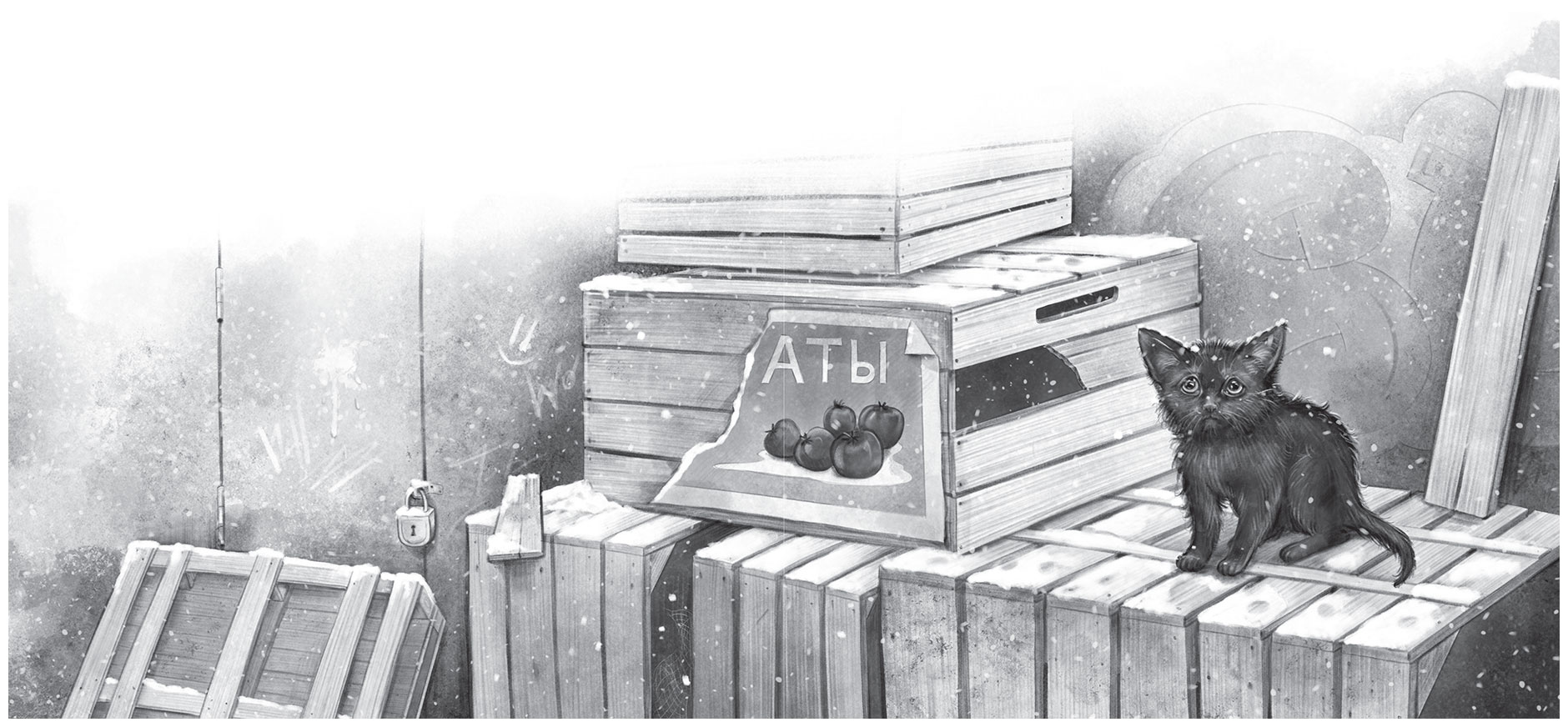 Пушистые снежинки неторопливо падали на землю, гаражи и ящики, укрывая котёнка. Он закрыл глаза, как вдруг раздался грозный лай собак. Малыш вздрогнул, вскочил и начал карабкаться по ящикам наверх в укрытие. Лапы скользили, и он чуть не сорвался вниз, но потом запрыгнул на крышу старого гаража. Там он был в безопасности. «А ну, пшли, пшли отсюда!» – услышал он чей-то голос.