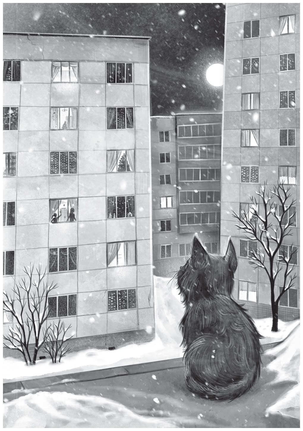 Взгляд котёнка упал на большой серый дом. На него малыш не хотел смотреть, чтобы не вспоминать тот ужасный день, когда его выпустили погулять и оставили на улице. Поэтому он отвернулся и принялся рассматривать другие дома. В их окнах уютно горел свет, задорно мигали огоньки. В одном из них котёнок увидел силуэты девочек, которые ещё не знали о его существовании, но жизнь которых очень сильно изменится после их встречи.