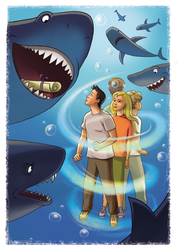 Добыть карту из зубастой пасти акулы и при этом остаться целыми и невредимыми практически невозможно. Тем временем акула, захлопнув рот, торжествующе посмотрела на ребят. Вот хитрюга, она специально продемонстрировала им карту: дала понять, что это не ей, а им от неё кое-что нужно. Однако акуле ничего не было известно о Юлиной суперсиле. Как только она закрыла пасть, Юля притянула акулу к себе и, зажав её подмышкой одной рукой, второй что есть мочи хлопнула её кулаком по носу. Всё произошло так быстро, что мальчики даже не сразу поняли, почему вдруг акула перевернулась вверх брюхом. Не теряя времени, пока та находилась в глубоком обмороке, девушка двумя руками разжала ей пасть. Женя, оказавшийся в этот момент ближе всех к Юле, выхватил из акульей пасти карту. Акула мигом пришла в себя, но Юля снова обхватила её двумя руками. Та попыталась высвободиться из крепких Юлиных объятий, но Юра, испугавшись за девушку, взмахнул мечом, который невесть откуда вдруг оказался у него в руках, и одним махом отрубил акуле голову. Ребята опешили. Юра тоже был потрясён – он и сам не ожидал такой развязки. Гибель соратницы и на акул произвела неизгладимое впечатление. Увидев, что она мертва, а карта находится в руках у Жени, они решили, что сражение окончено, и стали медленно расплываться. Ребята ликовали. Под водой они не могли кричать, поэтому молча, но очень эмоционально замахали друг другу руками.