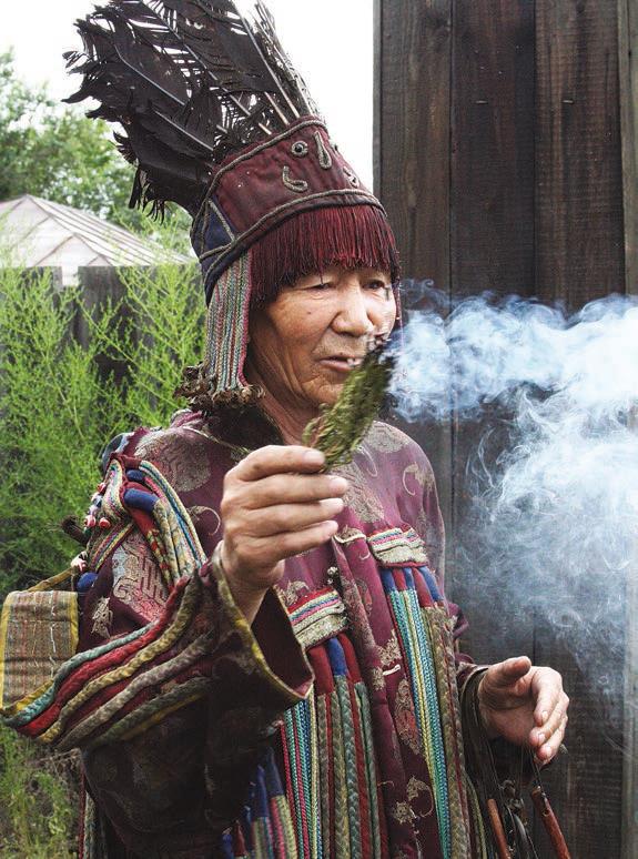 Рис. 0.10. Тувинский шаман с пучком веток горящего артыша – горного можжевельника. Фото автора. Кызыл, Тува.