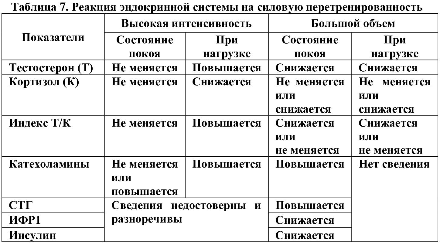Изменение гормонального статуса при перетренированности – повышение кортизола на 50 % и снижение тестостерона на 40 %, по мнению A. Urhausen с соавт. (1998), влияют и на психостатус спортсмена. В то же время наблюдается выраженное повышение содержания в крови гормонов катаболической направленности – кортикостероидов (Меньшиков И.В., Самигуллина Г.З., 2005). Чем выше интенсивность нагрузки и больше ее продолжительность, тем значительнее повышение концентрации кортикостероидов.