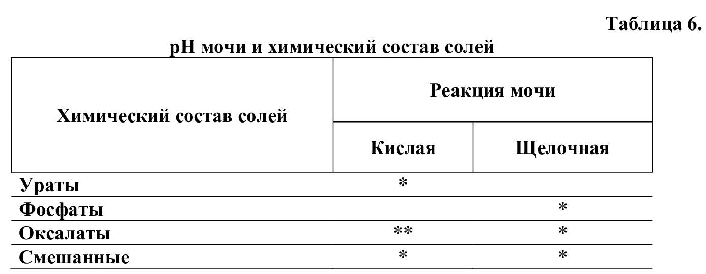 Известно, что химический состав солей, образующих камни в почках, зависит от характера обменных нарушений и кислотности мочи. Ураты образуются в кислой среде (при распаде собственных белков). Фосфаты – в щелочной среде. Оксалаты образуются в любой (чаще кислой) среде (имеет значение повышение концентрации ионов Ca, избыточный прием витамина С).