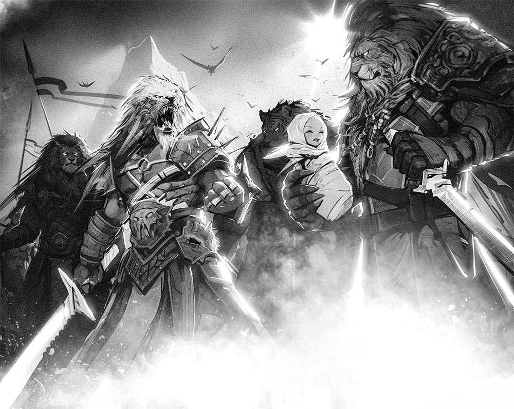 Левс – наполовину человек, наполовину лев, сам себя назначивший лидером Монстров, выглядел наиболее грозно и устрашающе. Во всей его огромной фигуре чувствовались невероятная сила и мощь, а ловкость, гибкость и плавность движений выдавали опытного и опасного противника. Из одежды на нем были только кожаные штаны да высокие сапоги. Обнаженный торс покрыт множеством татуировок и шрамов. Руки украшали браслеты из кожи убитых врагов, а могучую грудь – ожерелье из зубов, когтей, костей и прочих добытых в боях трофеев, бывших когда-то частями чьих-то тел. Нехитрый наряд дополняла латная перчатка на левой руке с угрожающего вида длинными лезвиями вместо когтей.