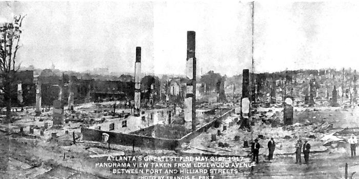Панорамный снимок остовов домов, сгоревших в Атланте в пожаре 1917 года.