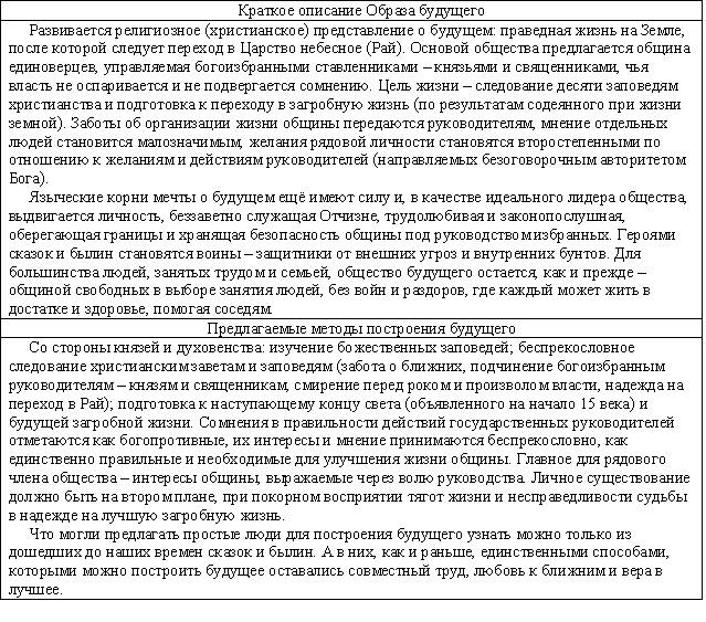 Каким представляли будущее закабаленные люди, которых лишили права выбора места жительства и права обращения к властям в случае притеснений со стороны помещика, чьей собственностью они стали? Внедрение в обществе единой религии (православия) и узаконивание крепостного рабства привело к созданию очередных барьеров, разделяющих общество: снижению самостоятельности и самооценки; замене нравственных ориентиров с общепринятых (труд на благо семьи и общины, забота о потомстве и вера в собственные силы) на религиозные суррогаты (принятие рабства, труд на господ и жрецов, вера в загробную жизнь). Любые проявления свободомыслия и критического осмысления общественных отношений вели к ужесточению закона и применению карательных мер в отношении тех, кто пытался защищать права обездоленных крестьян, распространяя правдивые сведения (скоморохи и сказители). Священники продолжали талдычить о священном праве господ на самоуправство и притеснения, требовали от крестьян смирения и веры в загробную жизнь, где воздастся за терпение и рабский труд.