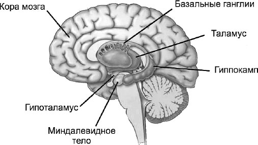3. Лимбическая система. Наконец, оставшаяся часть мозга между стволом в глубине и корой больших полушарий на поверхности и является одним из главных героев нашего повествования.
