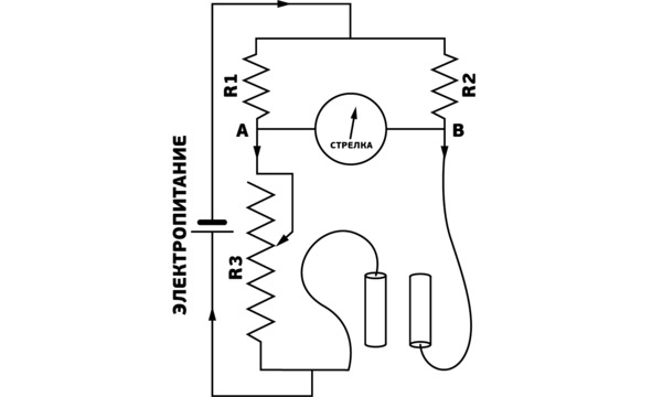 С технической стороны тета-метр – это обычный гальванометр (и один из вариантов его названий, «КГР-метр», говорит как раз о том, что он измеряет кожно-гальваническую реакцию). На рисунке ниже дана его простая принципиальная схема, т.н. «мостик Уитстоуна». Реальный прибор, конечно же, устроен намного сложнее. Но суть не меняется: тета-метр позволяет точно регистрировать даже незначительные изменения сопротивления поверхности кожи.