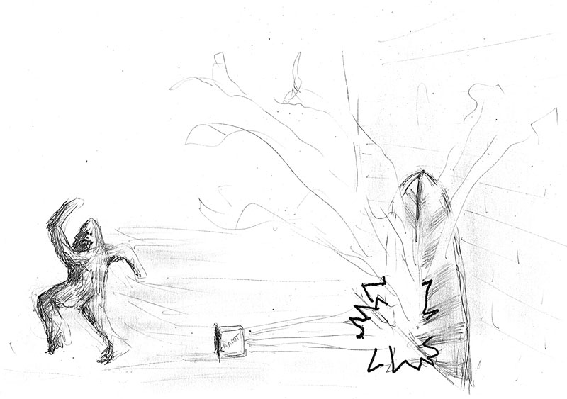 Изюминка плана состояла в отвлекающем маневре. В момент доставки груза сообщник должен был поджечь на улице большую салютницу и положить набок, так чтобы фейерверк взорвался не в ночном небе Москвы, а в дверях главного входа в «Бутырку». На роль этого сорвиголовы я предлагал своего друга, у которого в нашей тусовке на тот момент было прозвище Чубакка, или Чуи. Иллюстрация к отвлекающему маневру: