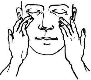 Далее делаем легкий массаж. Закрыв глаза, осторожно, без нажима, растирающими движениями массируем средними пальцами кожу нижних век. Длительность массажа – 15–20 секунд (рис. 2).