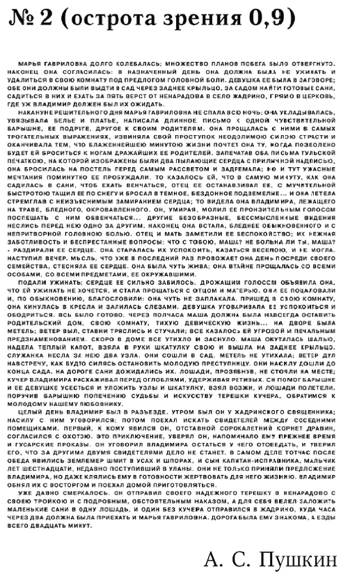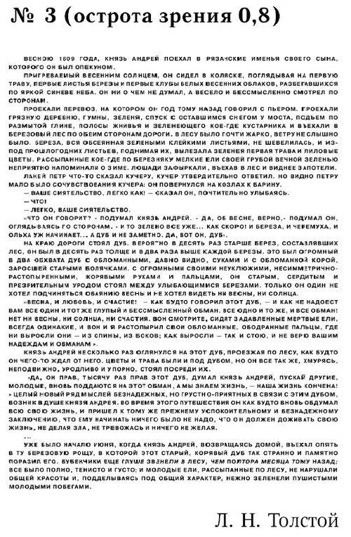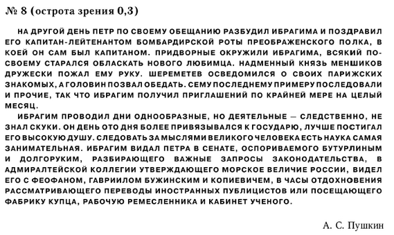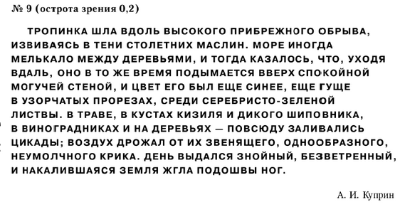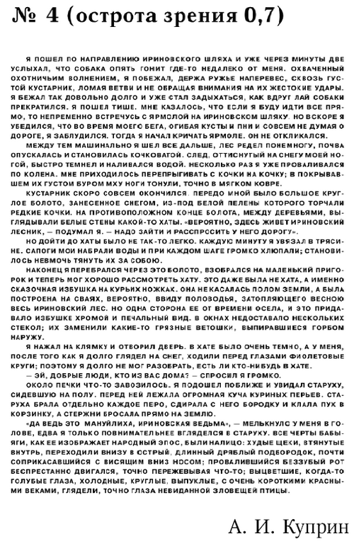 Выберете из приведенных выше отрывков самый мелкий шрифт, который можете читать свободно, без усилий на расстоянии 20–30 см. Если возникла необходимость читать с очками, то первоначально можете воспользоваться ими. Через некоторое время, когда зрение улучшится, надо будет снимать очки во время чтения. Если вы испытываете неприятные ощущения при чтении мелкого шрифта, немедленно прекратите упражнение. Дискомфорт свидетельствует о наличии напряжения, то есть о неправильном использовании вами своих глаз. В следующий раз начните читать более крупный шрифт. Текст читать 10–15 минут на расстоянии 20–30 см. Постепенно вы сможете читать без усилий все более мелкий шрифт. Время чтения, если вы не испытываете напряжения глаз, можно увеличить до 20–30 минут. Упражнение особенно рекомендуется близоруким.