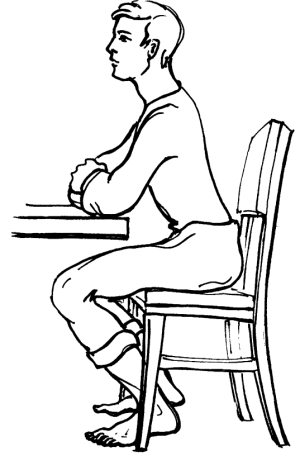 Во время пальминга держите глаза закрытыми. Пальминг (оладонивание) – это отдых, а глаза лучше всего отдыхают, когда они мягко прикрыты. Чем меньше света будет пробиваться к глазам, тем большего уровня расслабления вы сможете достичь. Обычно люди, стараясь исключить попадание света под ладони, сильно прижимают их к лицу. Это ошибка. Никакого напряжения в руках! Кисти рук должны быть расслаблены. Устраните напряжение в пальцах, расслабьте запястья, локти. Положите локти на колени или на стол так, чтобы шея образовала прямую линию с позвоночником. Можно также положить на колени подушку, а на подушку – локти. Если вам необходимо наклониться вперед, согнитесь в талии, но сохраните прямыми позвоночник и шею. Не держите голову за счет напряжения шейных мышц. Если пальминг проводится сидя за столом, ни в коем случае не нагибайте шею, не «переламывайтесь» в ней, не сутультесь и не горбите спину. Сгибание шеи ведет к быстрой утомляемости и пережиманию кровеносных сосудов, проходящих через шею и снабжающих кровью мозг и глаза. Эффект от упражнения в этом случае будет скорее негативный. Правильные действия таковы: отодвинуть немного стул от стола, согнуться в пояснице, но удержать шею и позвоночник на одной линии. Это сохранит правильную осанку и избавит от излишнего напряжения (рис. 9).