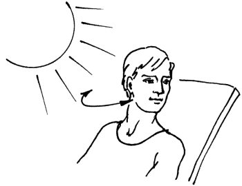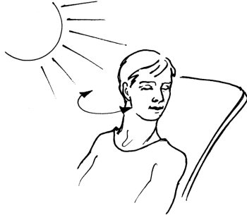 Сняв очки, усядьтесь поудобнее, откиньтесь назад, расслабьтесь, закройте глаза и подставьте лицо солнцу. Чтобы избежать внутреннего вглядывания и слишком долгого воздействия света на какой-нибудь участок сетчатки, плавно, но довольно быстро двигайте головой из стороны в сторону до окончания солнечной ванны. Некоторые люди ощущают дискомфорт даже при закрытых глазах. В этом случае следует сначала обратить лицо не к солнцу, а к небу. Когда свет станет переносимым, можно ненадолго повернуться к солнцу. Если снова ощутите дискомфорт – сразу отворачивайтесь и закрывайте глаза ладонями. Длительность упражнения 1–2 минуты (рис. 10).
