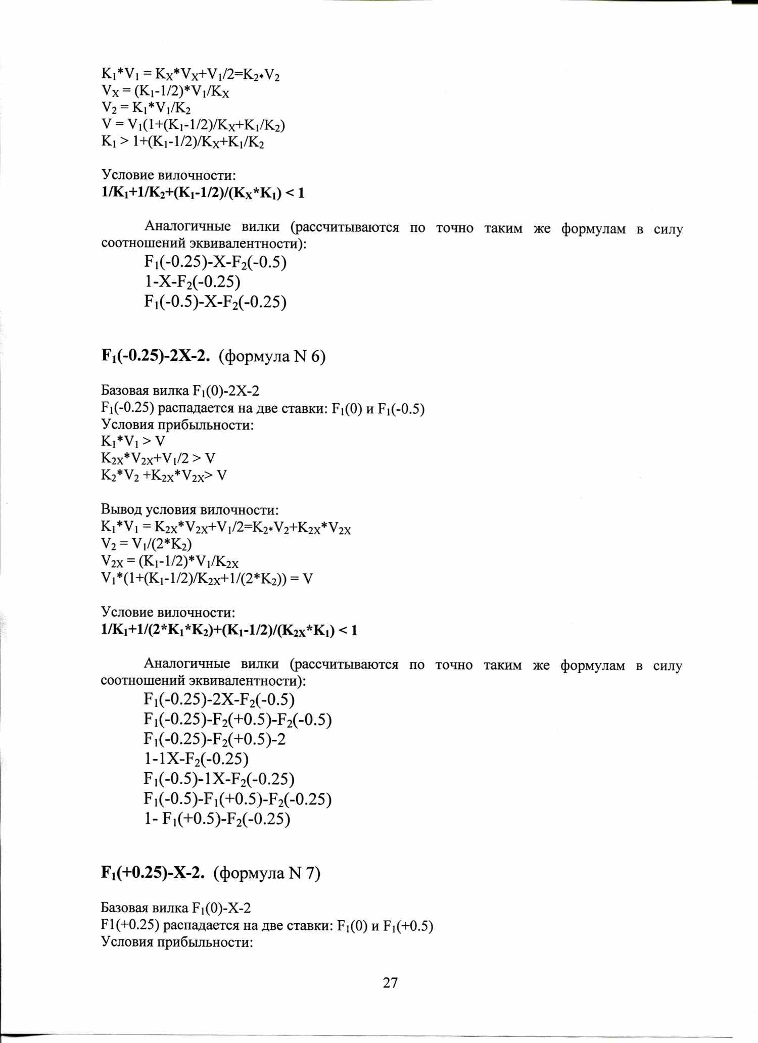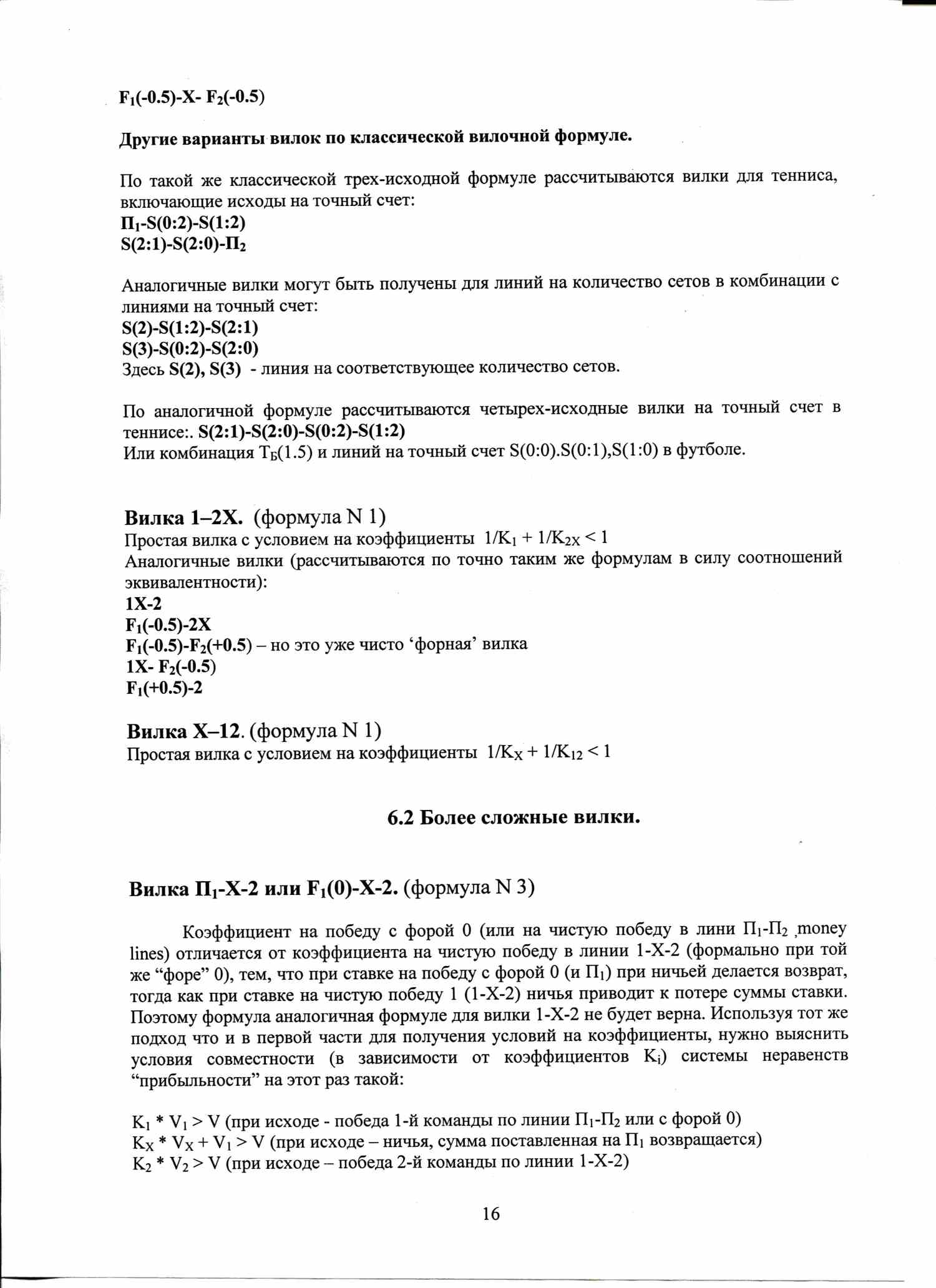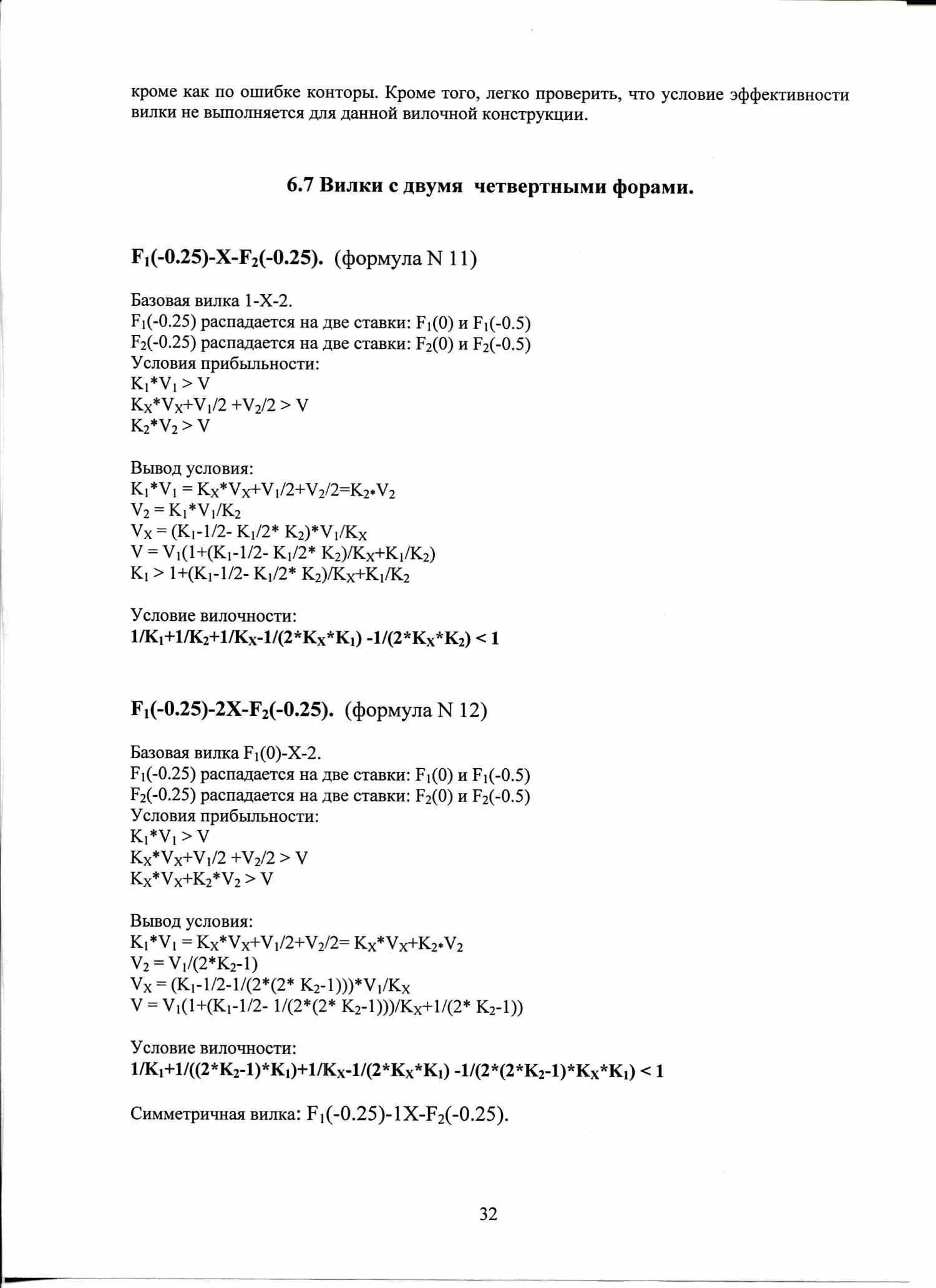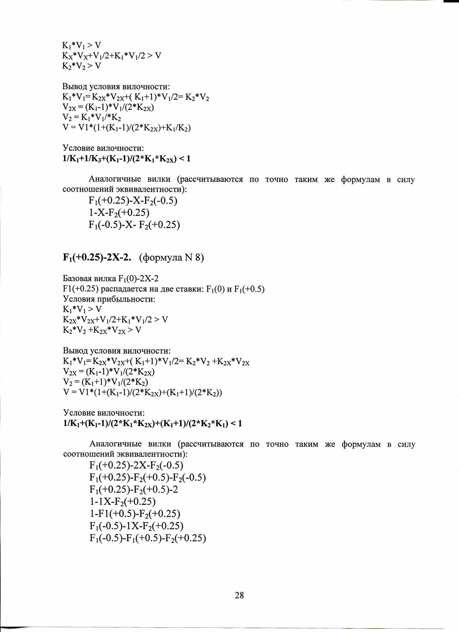 По аналогичной формуле вычисляются условия вилочности вилок с форами, тоталами, индивидуальными тоталами. Например, F1(+1)-F2(-1), или ТМ(2)-ТБ(2).
