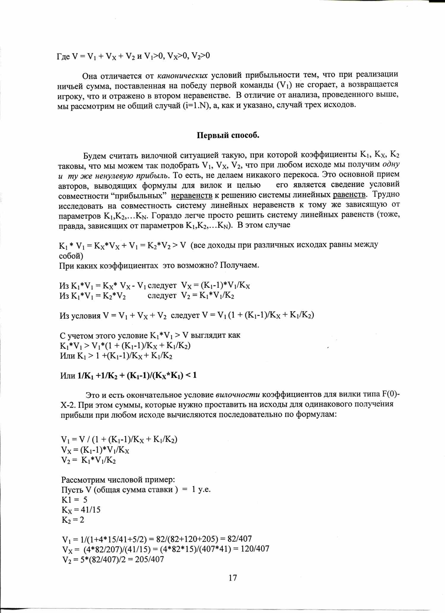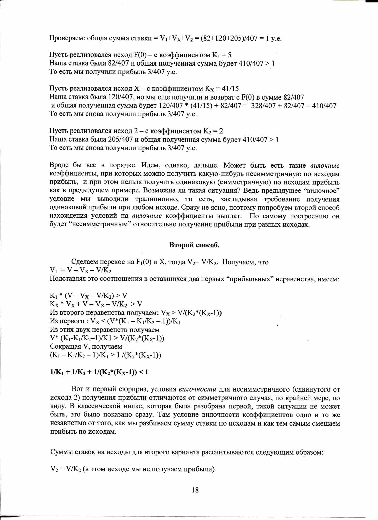 Условие получено без каких-либо предположений о способе разбиения общей суммы по исходам, а значит справедливо для всех без исключения вариантов. В силу изложенного выше вывода это условие является НЕОБХОДИМЫМ для существования “вилки”. Так как если вилка существует (удовлетворяются все исходные “прибыльные” неравенства), то в силу вывода коэффициенты Ki, i=1,N будут удовлетворять последнему соотношению.