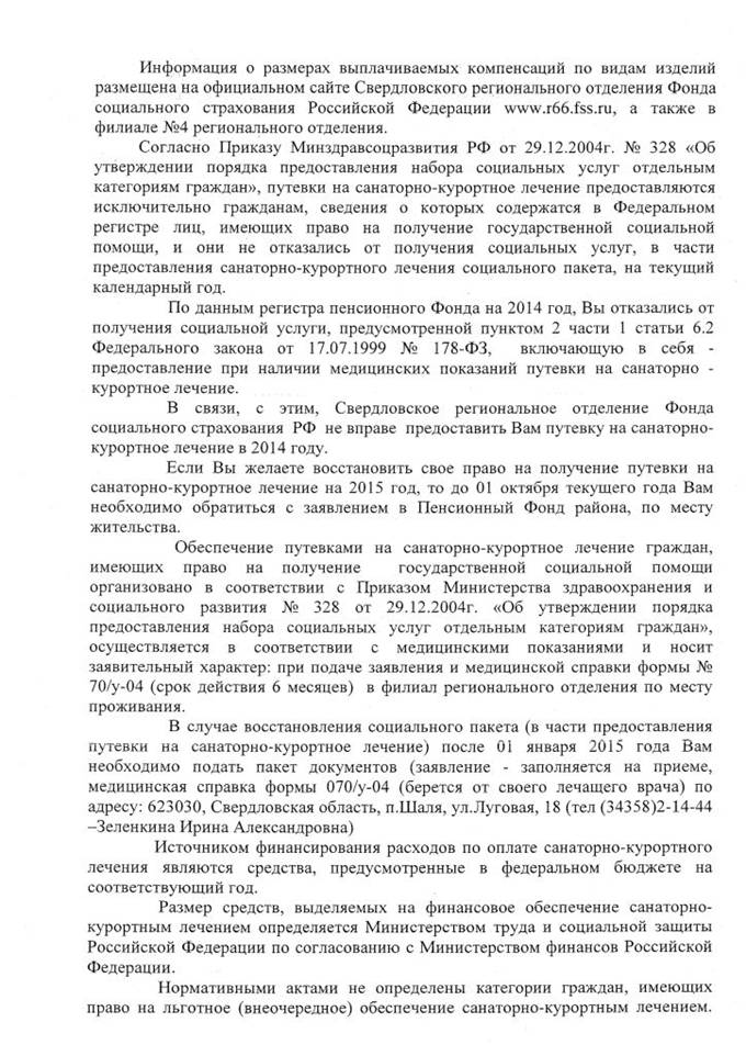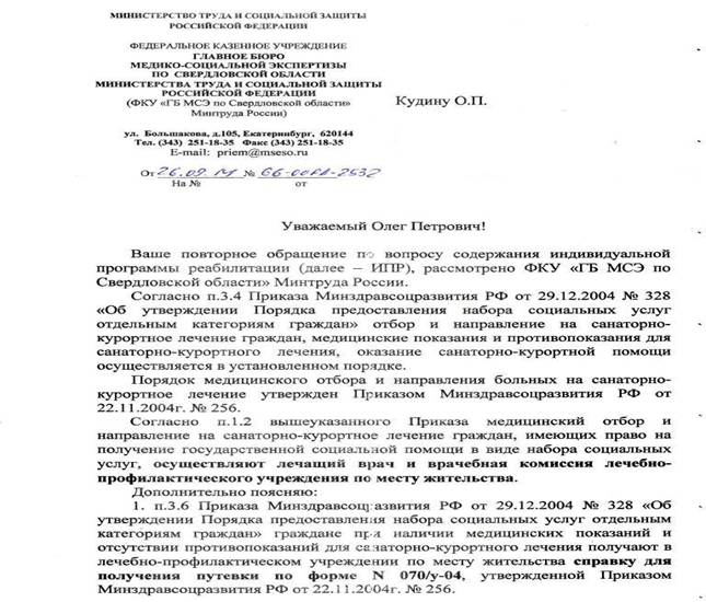 Ранее полученное Вами обращение было направлено 15.09.2014 г № 07-13-12/79 в ФКУ «ГБМСЭ по Свердловской области», с ответом полученным 22.09.14 г. № 6600РД-2489 я согласен только частично в части указания причины инвалидности "общее заболевание" без указания самого заболевания. Единственный вопрос на который я не получил ответ в данной части, как мне должны быть определены дни санаторно-курортного лечения, на основании какого документа, если в соответствии с Федеральным законом «О государственной социальной помощи» Статья 6.2. п3. Длительность санаторно-курортного лечения в рамках предоставляемого гражданам набора социальных услуг в санаторно-курортной организации составляет 18 дней, для детей-инвалидов – 21 день, а для инвалидов с заболеваниями и последствиями травм спинного и головного мозга – от 24 до 42 дней.