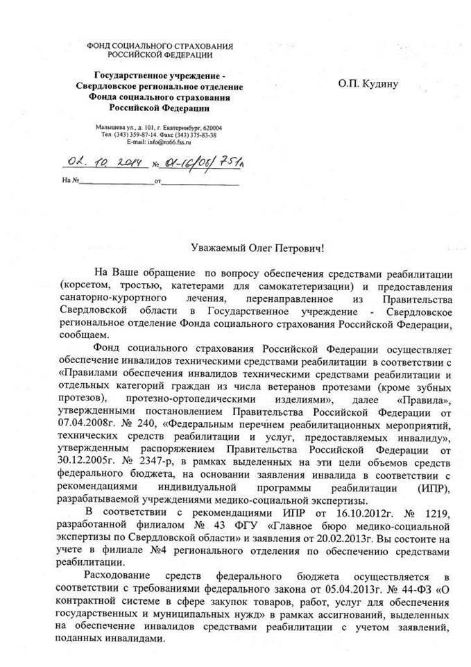 В соответствии с Федеральным законом от 2 мая 2006 года № 59-ФЗ «О порядке рассмотрения обращений граждан Российской Федерации» 04 сентября 2014 года я обратился в Правительство Свердловской области с просьбой объяснить мне, почему ФКУ "ГБ МСЭ по Свердловской области" бюро № 43 г. Первоуральска оформляя мне 30.10.2012 года, Индивидуальную программу реабилитации инвалида (ИПР) бессрочно, указала в разделе Технические средства реабилитации иуслуги по реабилитации ТСР без учета требований Приказа Министерства здравоохранения и социального развития Российской Федерации от 7 мая 2007 г. N 321 "Об утверждении сроков пользования техническими средствами реабилитации, протезами и протезно-ортопедическими изделиями до их замены" (в настоящее время принят Приказ Минздравсоцразвития РФ от 27.12.2011 N 1666н "Об утверждении Сроков пользования техническими средствами реабилитации, протезами и протезно-ортопедическими изделиями до их замены"), без учёта рекомендаций изложенных в письме от 5 мая 2006 г. N 2317-ВС Министерства здравоохранения и социального развития Российской федерации «Методические рекомендации по обеспечению инвалидов техническими средствами реабилитации в рамках федерального перечня реабилитационных мероприятий, технических средств реабилитации и услуг, предоставляемых инвалиду (предназначены для специалистов федеральных учреждений медико-социальной экспертизы)».