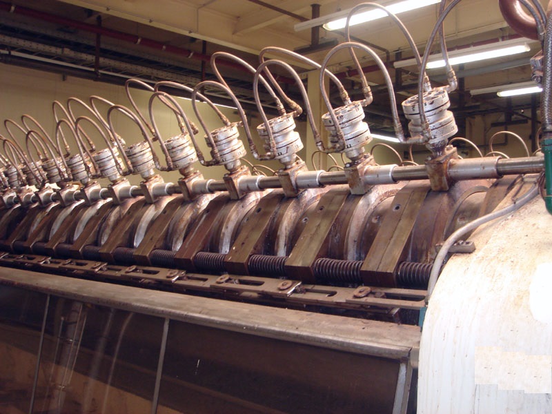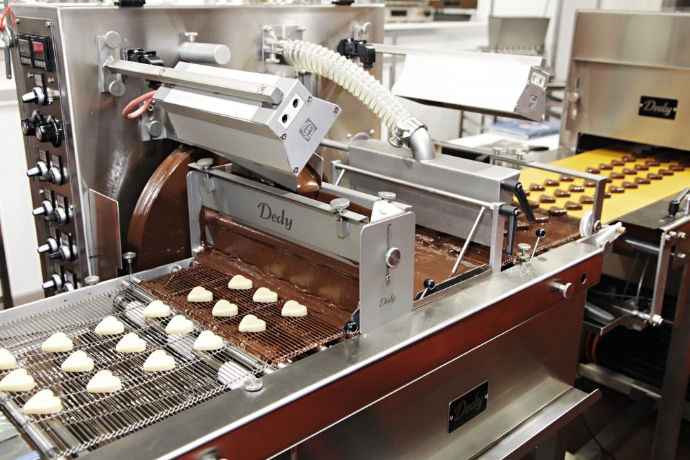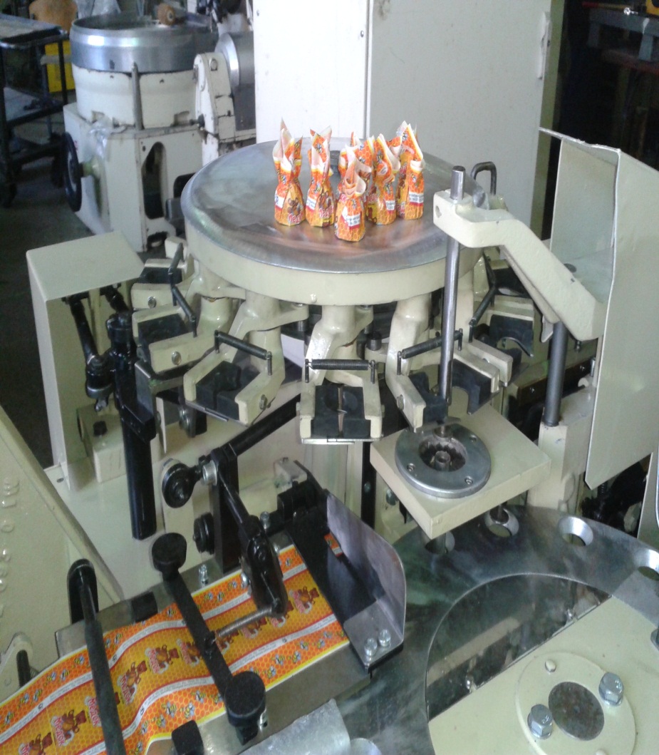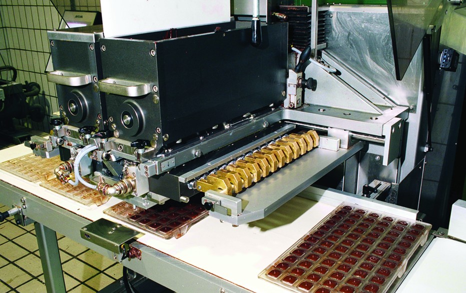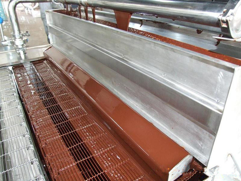 Подготовительный процесс закончен, можно делать шоколадки. Шоколадные плитки получают при розливе жидкого шоколада в специальные формы. Вот на таких станках.